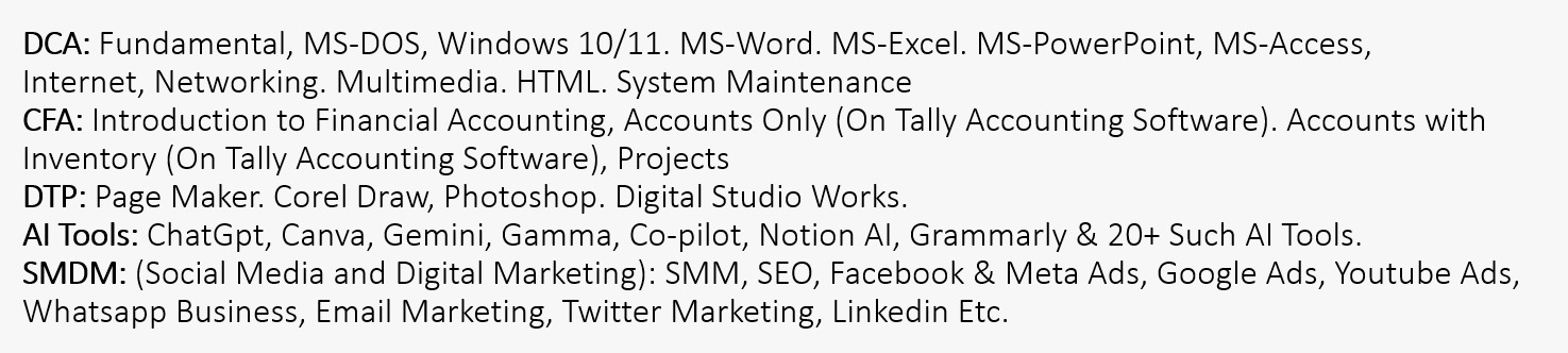 | DCA | Diploma in Computer Application | 6 Months | | 0.00 | ACTIVE | , |