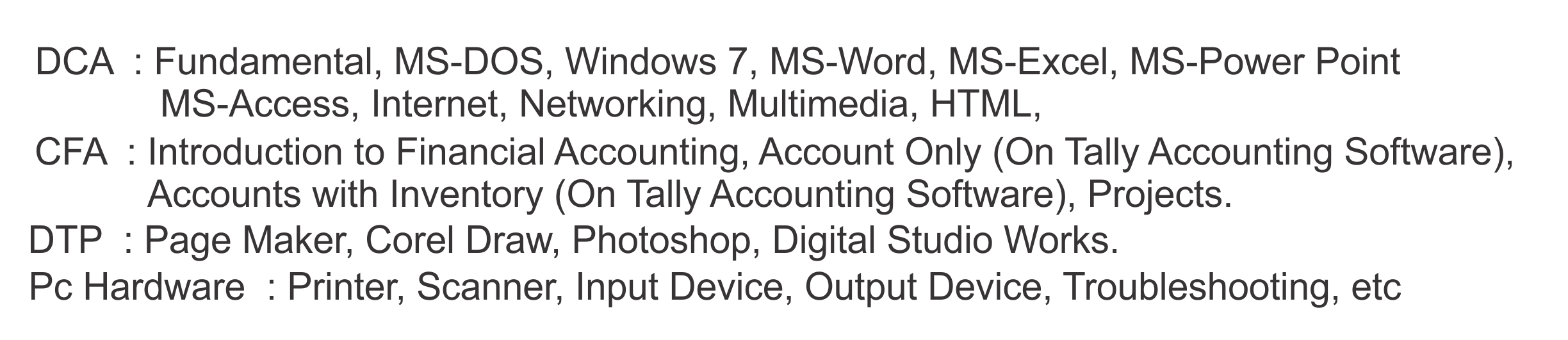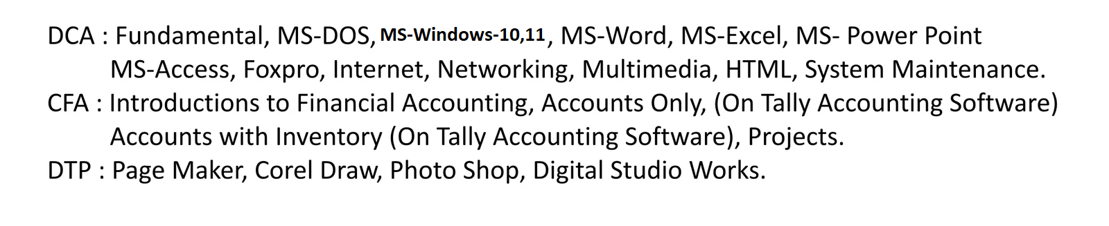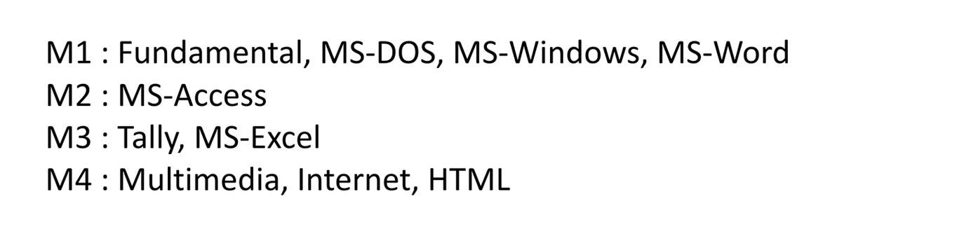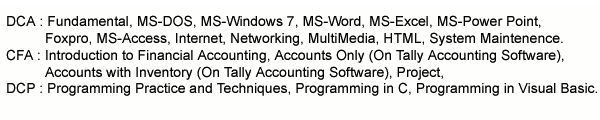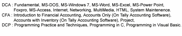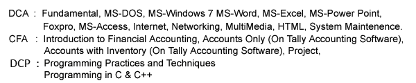 | DCA | Diploma in Computer Application | 6 Months | | 0.00 | ACTIVE | , |