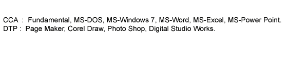 | , | CCA | Certificate in Computer Application | 3 Months | Non Matric | 0.00 | ACTIVE | , |